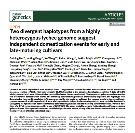 北京时间2022年1月4日,由乐竞在线注册亚热带农业生物资源保护与利用国家重点实验室牵头,联合相关单位完成的论文《高杂合荔枝基因组中两个不同单倍型表明早晚熟栽培品种各自独立驯化》(Two divergent haplotypes from a highly heterozygous lychee genome suggest independent domestication events for early and late-maturing cultivars)发表在《自然—遗传学》(Nature Genetics)。通讯作者包括乐竞在线注册园艺学院李建国研究员、夏瑞教授和陈厚彬研究员,美国伊利诺伊大学香槟分校Ray Ming教授,纽约州立大学布法罗分校Victor Albert博士。第一作者为乐竞在线注册胡桂兵教授、冯筠庭博士生、刘成明教授、吴振先教授,广东省农业科学院向旭研究员,新加坡南洋理工大学Jarkko Salojärvi博士和中国热带农业科学院王家保研究员。