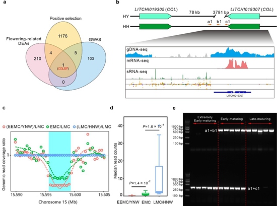 此外,该论文从基因组层面对荔枝开花调控机制进行了系统性研究,发现荔枝中一段特定的DNA序列缺失,可能是导致荔枝不同花期形成的重要因素。这一段DNA片段缺失出现在一对CONSTANS-like (COL)基因之间,它可能通过调控这两个COL基因的表达,从而影响荔枝开花时间。这个DNA序列缺失可以开发为简便的分子标记,用于不同开花期荔枝品种的选育。这对荔枝针对花期和成熟期性状的选育种工作非常有价值,因为荔枝易腐烂、难贮存,选育更多极早或特晚开花的荔枝新品种对延长荔枝上市季节、减少市场季节性销售压力、提升荔枝种植效益非常重要。