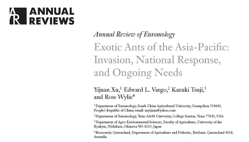 近日,乐竞在线注册植物保护学院许益镌教授联合美国德克萨斯农工大学Edward L. Vargo教授、日本琉球大学Kazuki Tsuji教授和澳大利亚的Ross Wylie博士在昆虫学权威期刊Annual Review of Entomology(IF5YEAR=20.265)上发表了特邀综述“Exotic Ants of the Asia-Pacific: Invasion, National Response, and Ongoing Needs”。