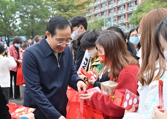 春节将至,为把学校对留校学生的关怀落实做细,确保留校学生度过一个欢乐祥和的寒假,学校在寒假期间开展“喜迎新春·情暖华农”关爱学生活动。1月25日,校党委书记王斌伟,党委副书记、校长刘雅红,党委副书记钟仰进走访慰问假期留校学生,为同学们派送新春大礼包和新年慰问金,送上美好祝福和温暖关爱。