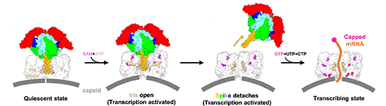 课题组已经发表了有关BmCPV病毒转录(Zhang X, et al., Nature, 2015; Cui Y, et al., Nature Structural & Molecular Biology, 2019)及加帽 (Yu, Jiang et al., eLife, 2015)的前期研究成果,该研究还阐明了SAM和ATP等胞内小分子是如何通过与病毒塔状突起蛋白(turret protein)上的活性位点结合,激活BmCPV病毒衣壳中“入侵-转录-加帽”的信号通路,并促使BmCPV病毒在感染的不同阶段启动相关结构蛋白执行功能。