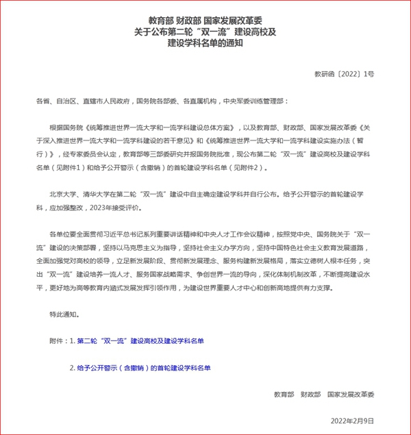 2月14日,教育部、财政部、国家发展改革委公布第二轮“双一流”建设高校及建设学科名单,乐竞在线注册入选。