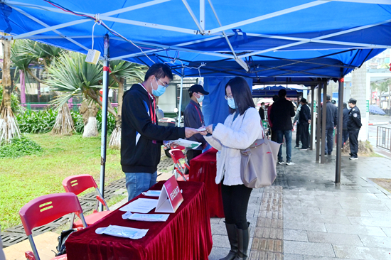 在演练中,由20名辅导员扮演的“返校学生”按照间距一米的要求,进入返校学生专用通道分散等候报到,经工作人员查验健康码、行程码和48小时内核酸检测阴性证明后,刷校园卡或刷脸测温无异常后,在报到点洗手和更换口罩后进入校园,等候校巴接送至宿舍区或自行返回宿舍区。根据前期安排,本次演练设置了体温检测异常、复测后正常,体温检测异常、复测后仍然异常,未经批准返校,粤康码为黄码、红码或者行程码带星号,设备出现故障等五类异常情况应急处置。