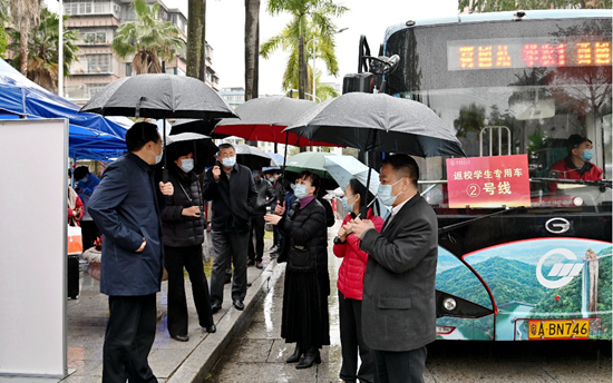 为做好2022年春季学期学生返校工作,2月19日上午,校党委书记王斌伟,校党委副书记、校长刘雅红,校党委副书记钟仰进,副校长杨运东一行来到学校西南门,实地察看学生返校工作情况,慰问一线工作人员及学生志愿者。