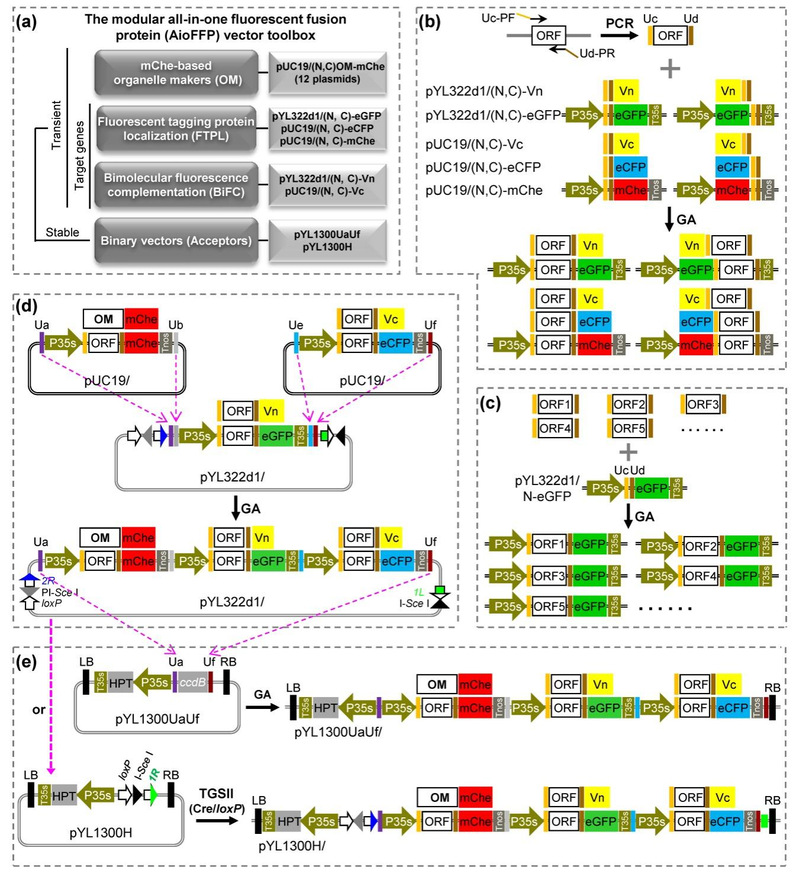 基于荧光蛋白标记的蛋白定位(FTPL)和双分子荧光互补(BiFC)技术是在植物体内分析蛋白质亚细胞定位和蛋白间相互作用的常用工具。相比于以往使用的多个质粒共同转化相比,将多个表达盒组装于单一质粒上进行转化能够提高不同融合蛋白的共表达效率。该模块化AioFFP载体工具箱利用特异核苷酸序列引导的高效Gibson组装反应(一种不依赖限制性内切酶的DNA连接方法,可使用购买的试剂盒或自配试剂盒),可实现将不同荧光标记蛋白的功能模块进行高效灵活组装。其包括了一套基于mChe荧光蛋白的亚细胞器标记蛋白质粒(12个)、基于eGFP和eCFP及mChe的FTPL载体(6个)、基于Vn和Vc的BiFC载体(4个)以及2个双元接受载体,如下图1所示。