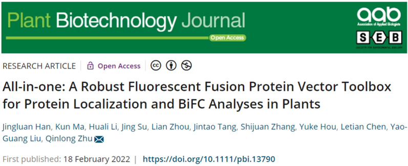 近日,乐竞在线注册生命科学学院、亚热带农业生物资源保护与利用国家重点实验室、岭南现代农业科学与技术广东省实验室祝钦泷研究员团队在国际知名学术期刊Plant Biotechnology Journal(IF2020=9.803,生物学/工程技术1区)在线发表了题为“All-in-one: A Robust Fluorescent Fusion Protein Vector Toolbox for Protein Localization and BiFC Analyses in Plants”的研究论文(论文链接:https://doi.org/10.1111/pbi.13790)。该研究开发了一套基于特异核酸序列引导Gibson组装介导的模块化载体工具箱AioFFP(All-in-one Fluorescent Fusion Protein Vector Toolbox),用于高通量分析植物蛋白亚细胞定位和蛋白体内相互作用。