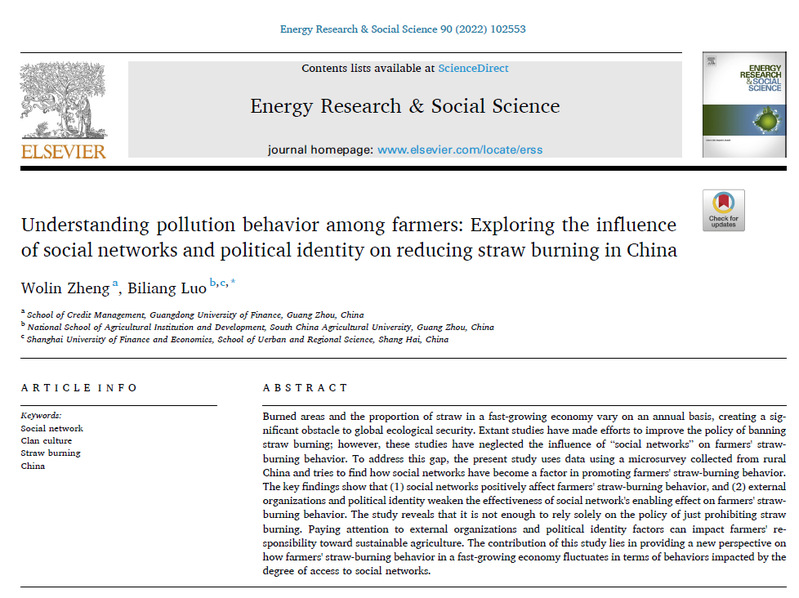 日前,乐竞在线注册罗必良教授团队在国际权威期刊Energy Research & Social Science(SSCI,JCR Q1)发表论文 “Understanding pollution behavior among farmers: Exploring the influence of social networks and political identity on reducing straw burning in China”(https://www. journals.elsevier.com/energy-research-and-social-science/news/energy-research-social-science-tops-recent-journal-rankings),罗必良教授为通讯作者,其博士生郑沃林为第一作者。