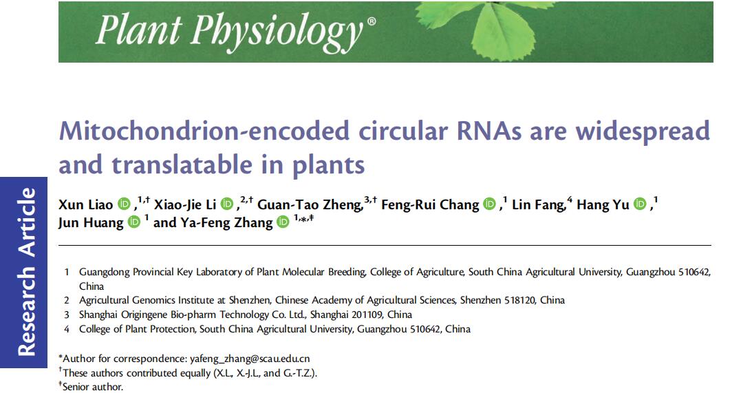 近日,乐竞在线注册农学院、广东省植物分子育种重点实验室张亚锋副教授在国际知名期刊Plant Physiology(IF2020=8.34,生物1区)发表了题为“Mitochondrion-encoded circular RNAs are widespread and translatable in plants”的研究论文(论文链接:https://doi.org/10.1093/plphys/kiac143)。该研究开发了1款适合植物线粒体基因组编码环状RNA(mitochondrion-encoded circRNA,mcircRNA)的识别算法(算法链接:https://www.github.com/zyfscau/MeCi),并证明mcircRNA不仅广泛存在于植物中,而且可以翻译成蛋白质。