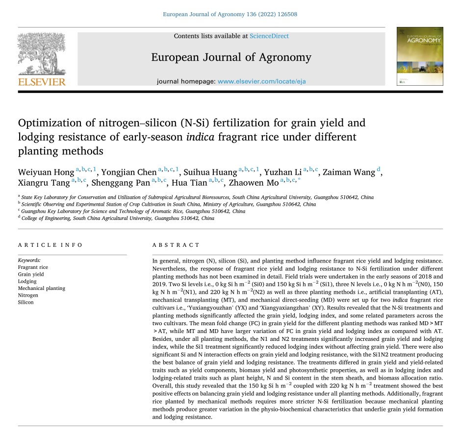 农学院硕士研究生洪卫源、陈用建和21届博士毕业生黄穗华为共同第一作者,在农林科学领域TOP期刊European Journal of Agronomy(一区,IF2020 =5.124)上发表了题为“Optimization of nitrogen–silicon (N-Si) fertilization for grain yield and lodging resistance of early-season indica fragrant rice under different planting methods”的论文 (论文在线网址:https://doi.org/10.1016/j.eja.2022.126508)。针对华南双季稻区的早季香稻种植因多雨和台风天气常发生而导致的产量和倒伏问题严重,本研究探讨了氮-硅施肥调控不同种植方式下的产量和抗倒伏能力。研究表明:与人工移栽相比较,机械种植方式要提高产量和增强抗倒伏能力对氮-硅的精确施肥提出了更高的要求。增加氮肥施用可以增加植株生物量、叶面积指数和净光合速率,影响产量构成因素,最终增加产量。但是,同时也提高了株高、茎秆氮含量和穗干重占比,降低了植株抗折力和茎秆纤维素与木质素含量,使得倒伏系数增加。而施用硅肥能够缓解因施氮带来的不利影响,从而增强植株抗倒伏能力。