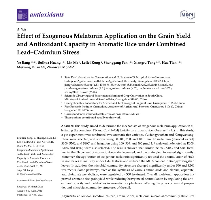 农学院硕士研究生姜烨和21届博士毕业生黄穗华为共同第一作者,在国际权威Top期刊Antioxidants(医学二区, IF2020 =6.313)上发表了题为“Effect of Exogenous Melatonin Application on the Grain Yield and Antioxidant Capacity in Aromatic Rice under Combined Lead–Cadmium Stress” 的研究论文(论文在线网址:https://doi.org/10.3390/antiox11040776)。针对香稻高产抗逆栽培生理研究和栽培新技术创建,本研究探讨了外源生长调剂物质应用(褪黑素)对镉铅复合胁迫下的栽培调控机理。研究表明适宜的外源褪黑素水平能降低香稻籽粒铅含量和提高香稻产量。外源性褪黑素通过降低H2O2和丙二醛的积累,影响根际微生物群落结构和叶片氨基酸代谢等缓解镉铅复合胁迫。