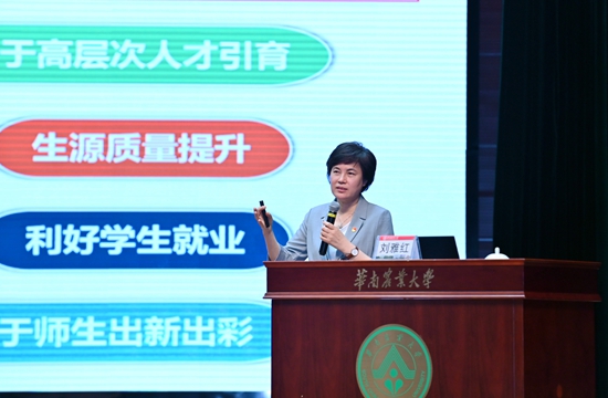 在深入分析学校发展优势及短板的基础上,刘雅红系统阐述了学校“双一流”建设的思路与举措,为同学们描绘了一幅“双一流”建设的美好蓝图。她指出,作为国家在华南地区布局的唯一一所“双一流”农业高校,学校要立足广东,服务华南,面向全国,走向世界,聚焦全面乡村振兴、粤港澳大湾区建设、农业绿色发展、生态文明建设等国家重大战略,全面融入区域及国家经济社会发展主战场,建成我国农林拔尖创新人才培养的重要基地、现代农业科技创新的重要引擎、国际现代生物育种的创新高地、先进农业文化创新传承的重要阵地和粤港澳大湾区国际科技创新走廊的重要节点,争当热带亚热带地区乡村全面振兴服务的排头兵。