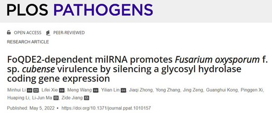 近日,乐竞在线注册植物保护学院、广东省微生物信号与作物病害防控重点实验室姜子德/李敏慧团队在PLoS Pathogens(IF,6.823,中科院1区Top期刊)上在线发表了题为“FoQDE2-dependent milRNA promotes Fusarium oxysporum f. sp. cubense virulence by silencing a glycosyl hydrolase coding gene expression ”的论文。
