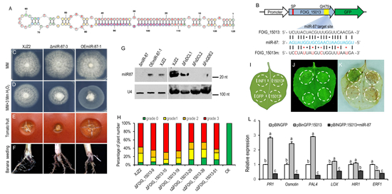 香蕉枯萎病是制约世界香蕉生产的毁灭性病害,探索其病原真菌致病机理将为发展高效病害防治药剂提供分子靶标。该研究团队前期研究发现在香蕉枯萎病菌侵染初期,与milRNA生物合成密切相关的Argonaute(AGO)和Dicer蛋白合成基因(FoQDE2,FoDCL1和FoDCL2)显著的高表达;当敲除这些基因后,发现只有FoQDE2敲除突变体的致病力显著降低。因此推测可能一些依赖AGO蛋白的milRNA参与到病原菌的致病过程。为解析香蕉枯萎病菌FoQDE2敲除突变体致病力降低的原因,通过小分子RNA的高通量测序和生物信息分析,在FoQDE2敲除突变体中筛选到25个显著下调的小RNA。经qRT-PCR、Northern杂交表达分析以及其前体二级结构预测,鉴定到4个依赖FoQDE2合成的milRNAs。对其中一个在香蕉枯萎病菌侵染寄主24-96 h持续显著高表达的milRNA:milR-87进行了功能分析。结果发现,敲除milR-87后香蕉枯萎病菌的产孢能力、对过氧化氢的耐受能力、对玻璃纸的穿透能力以及对寄主香蕉苗的致病力均显著下降,而过表达该milRNA,这些表型及致病力均增强,说明milR-87是香蕉枯萎病菌一个关键的致病因子。
