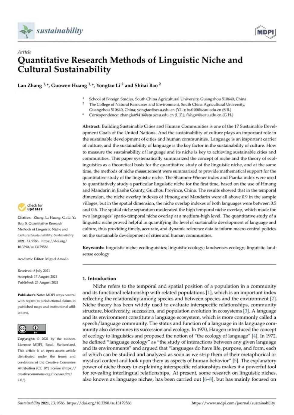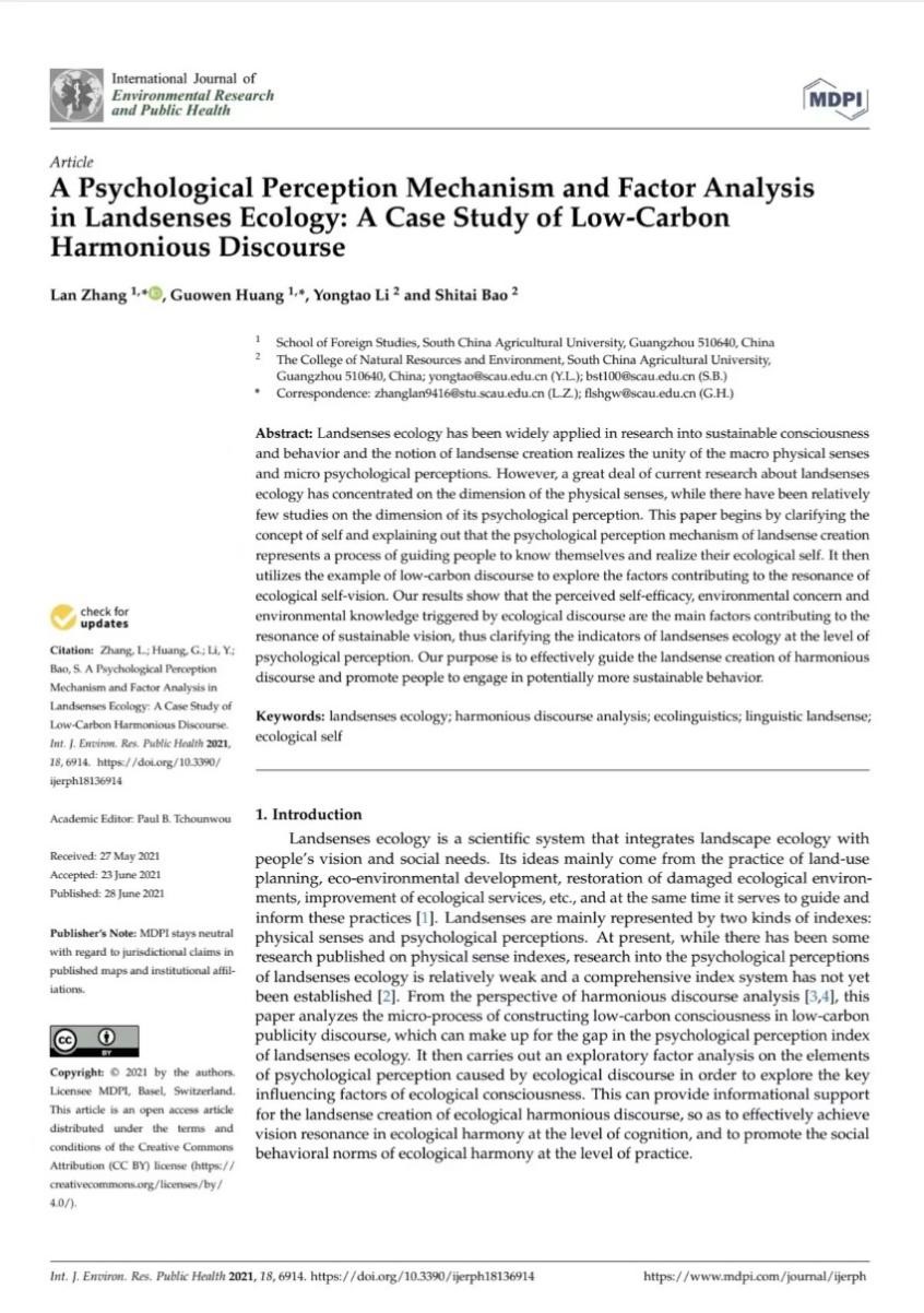 近日,乐竞在线注册外国语学院黄国文教授团队先后在可持续发展与生态研究领域的三个知名期刊发表四篇论文。在International Journal of Sustainable Development & World Ecology(SCI,JCR Q2,影响因子3.716)发表了两篇论文:(1)“The application of landsenses ecology in language carriers”(链接:https://doi.org/10.1080/13504509.2021.1920062),(2)“Advancement trajectory of emerging landsenses ecology for sustainability research and implementation”(链接:https://doi.org/10.1080/13504509.2022.2075483)。在国际期刊International Journal of Environmental Research and Public Health (SCI,JCR Q1,影响因子3.390) 发表论文“A Psychological Perception Mechanism and Factor Analysis in Landsenses Ecology: A Case Study of Low-Carbon Harmonious Discourse”(链接:https://doi.org/10.3390/ijerph18136914)。在国际期刊Sustainability(SCI,JCR Q2, 影响因子3.251)发表论文“Quantitative Research Methods of Linguistic Niche and Cultural Sustainability”(链接: https://doi.org/10.3390/su13179586)。此四篇论文均以黄国文教授为通讯作者,其博士生张兰为第一作者,共同作者包括乐竞在线注册资源环境学院李永涛教授和包世泰副教授。