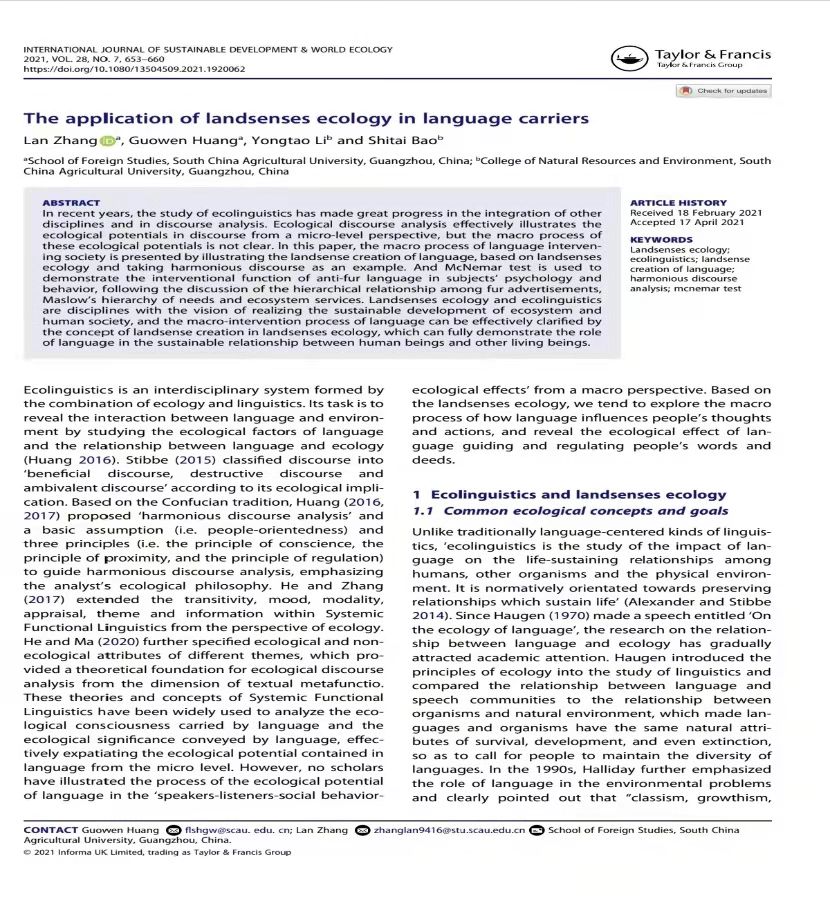 语言是一种表达观念的符号系统,对人类的意识形态及行为具有干预功能,因而对社会观念、人与其它动物的和谐关系及自然资源的合理应用等生态问题具有建构作用,已有学者将生态语言学及系统功能语言学等理论用于解析语言所承载的生态意识,有效地从微观上阐述了语言所蕴含的生态潜能,而语言构建社会的宏观过程较少论述。“The application of landsenses ecology in language carriers”一文基于生态学的最新进展——景感生态学,建构了语言干预社会的景感营造过程,并结合McNemar配对检验验证了语言引导和规范人们言行的生态效应。从微观与宏观两个层面证明了语言在人与人、人与其他物种和环境的可持续发展关系中的影响和作用。
