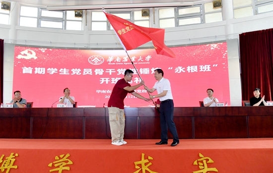 王斌伟为首期“永根班”授班旗,校党委副书记邓国安宣读了“永根班”临时党支部、班委名单。据悉,首期“永根班”48名学员来自全校22个学院,将在为期一年的时间内,学习党的创新理论、四史和校史、党务基本知识和实践、耕读教育、管理素养、专项研究等培训内容。