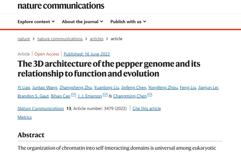 6月16日,乐竞在线注册园艺学院在著名学术期刊《Nature Communications》(5年影响因子15.8,中科院一区,TOP期刊)上发表题为“The 3D architecture of the pepper genome and its relationship to function and evolution” 的研究论文(论文链接: