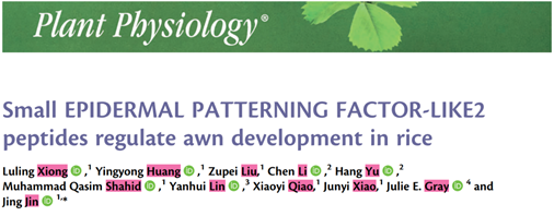 近日,乐竞在线注册农学院、广东省植物分子育种重点实验室青年教师金晶在国际知名期刊Plant Physiology(影响因子8.34,生物1区)发表了题为“Small EPIDERMAL PATTERNING FACTOR-LIKE2 peptides regulate awn development in rice”的研究论文(论文链接:https://doi.org/10.1093/plphys/kiac278)。