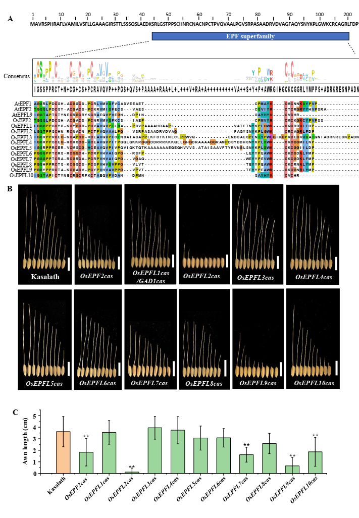 多肽分子调控细胞间的信号,在生物的形成以及发育中发挥重要的作用。植物细胞间的相互交流也是通过大量的信号分子。最近的研究已揭示了植物多肽激素参与细胞与细胞间的短距离信息的沟通交流,从而调控植物生长、发育、抗逆等许多生命过程。其中,EPF/EPFL 家族基因所编码的多肽激素是植物中一类重要的多肽家族,参与调控气孔、颖花和芒的发育。然而,水稻EPF/EPFL家族的成员及其功能尚待鉴定。