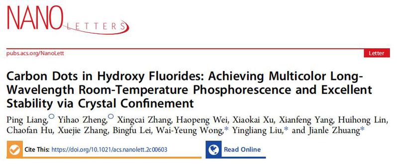 近日,乐竞在线注册材料与能源学院生物基材料与能源教育部重点实验室、广东省光学农业工程技术研究中心刘应亮教授团队在碳点基室温磷光材料研究中取得重要进展,相关研究成果以“Carbon Dots in Hydroxy Fluorides: Achieving Multicolor Long-Wavelength Room-Temperature Phosphorescence and Excellent Stability via Crystal Confinement”(论文链接:https://pubs.acs.org/doi/10.1021/acs.nanolett.2c00603)为题发表在纳米领域国际权威期刊《Nano Letters》上。材料与能源学院2020级硕士研究生梁萍和研究助理郑义浩(2019届材料科学与工程专业本科毕业生)为论文共同第一作者,庄健乐副研究员、刘应亮教授和香港理工大学黄维扬教授为共同通讯作者。
