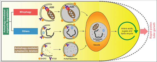 该研究发现自噬在拟南芥花粉管生长和雄性育性过程中发挥重要生物学功能。通过研究和追踪自噬报告蛋白SH3P2和核心ATG蛋白的亚细胞定位和运动轨迹,揭示了自噬在花粉管中的生物发生过程与时空分布。进一步研究发现,抑制自噬可显著抑制拟南芥花粉萌发、花粉管生长和植物受精过程。在生长的花粉管中,对ATG8e标记的自噬小体和去极化线粒体实时追踪成像发现,它们在时空上可以发生结合与互作,诱导线粒体自噬的发生,且进一步发现该互作是由ATG8-family interacting motif(AIM)识别位点所特异性介导。最后,该研究发现,在花粉管中,线粒体自噬与多种形式的自噬共同存在并维系花粉管的快速生长,在拟南芥雄配子体受精过程中发挥重要的调控功能。该研究对深入阐明自噬调控花粉管极性生长和育性的分子作用机制和生物学功能奠定了重要的理论基础。