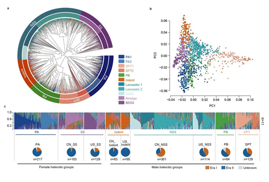 玉米是世界,也是我国的第一大作物,在保障全球和我国粮食安全方面具有不可替代的作用。玉米杂交种(单交种)与其父母本相比,具有很强的杂种优势。玉米单交种自从20世纪60年代开始在生产上大面积推广,迄今其利用率已达到近100%。玉米单交种是由分别来自母本杂种优势群和父本杂种优势群的自交系杂交组配而成,而杂优模式是指特定的母本群和父本群中个体杂交后具有强杂种优势的配组方式。长期以来,国外(美国为主)形成了SS系、NSS系和Iodent系三个主要杂种优势群,而我国除了引进国外的SS、NSS、Iodent种质资源外,还形成了我国独特的SPT, PA和PB等新的杂种优势群。生产上SS和PA系常用做母本,而NSS、Iodent、SPT和PB系常用做父本。国内外半个多世纪的育种史表明,玉米单产水平的提升(3倍以上)主要取决于父、母本杂种优势群的持续改良和杂优模式的优化。然而,现代育种过程中父、母本杂种优势群的遗传改良规律及其基因组学基础尚不清楚,导致父、母本自交系选育和杂交组配效率低、盲目性大、可预见性差,制约着突破性玉米新品种的培育。
