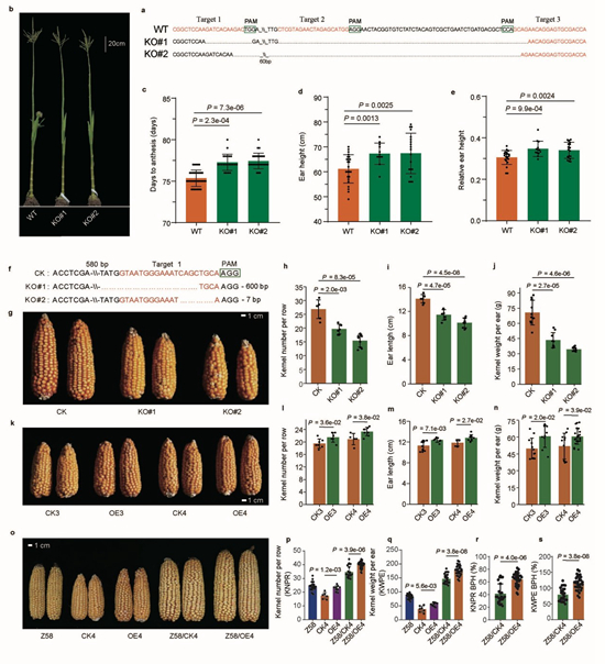 图2. 现代育种选择基因ZmEMF1L1 (a-e) 和分化基因ZmKOB1 (f-s)的功能验证