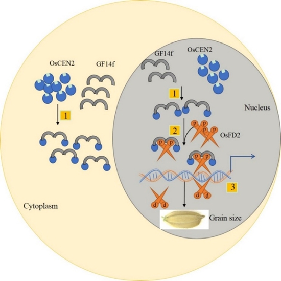 OsCEN2–GF14f–OsFD2调控水稻种子大小工作模型