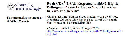 近日,乐竞在线注册兽医学院重大动物疫病防控团队在家禽T细胞研究中取得重要进展,相关研究成果以“Duck CD8+ T cell response to H5N1 highly pathogenic avian influenza virus infection in vivo and in vitro” (论文链接:https://www.jimmunol.org/content/early/ 2022/08/08/jimmunol.2101147)为题发表在免疫学领域国际权威期刊《Journal of Immunology》。兽医学院代曼曼副教授为论文第一作者,兽医学院研究生导师、广东省农科院廖明教授为通讯作者。