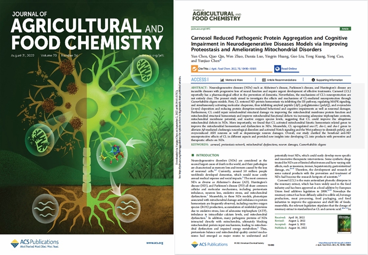 在Journal of Agricultural and Food Chemistry期刊上发表的题为“Carnosol Reduced Pathogenic Protein Aggregation and Cognitive Impairment in Neurodegenerative Diseases Models via Improving Proteostasis and Ameliorating Mitochondrial Disorders”的封面文章,一区TOP,影响因子为5.895(原文链接:https://pubs.acs.org/toc/jafcau/70/34)。