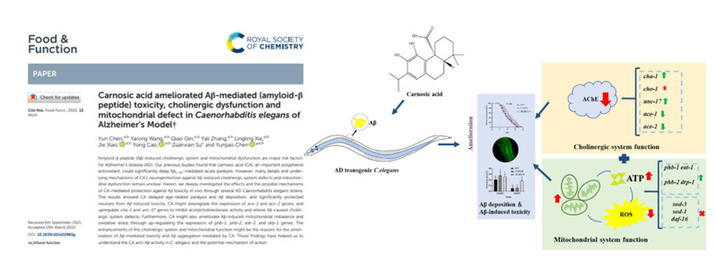 在Food & Function期刊上发表的题为“Carnosic Acid Ameliorated AΒ-Mediated (Amyloid-β Peptide) Toxicity, Cholinergic Dysfunction and Mitochondrial Defect in Caenorhabditis Elegans of Alzheimer’s Model”的论文,中科院二区,影响因子为6.317(原文链接:https://pubs.rsc.org/en/content/articlehtml/2022/fo/d1fo02965g)。