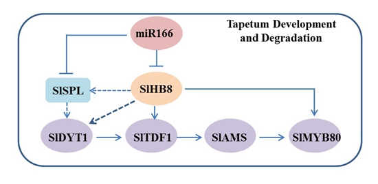 该研究发现番茄中的HD-zip III家族转录因子SlHB8是一个调控绒毡层降解的基因,该基因定位于绒毡层及小孢子组织中。SlHB8基因的敲除导致花粉活力和座果率上升;SlHB8基因的早期超量表达会导致绒毡层的降解提前,花粉内含物和花粉内壁消失,花粉活力下降,座果率下降。转录组和DAP-seq的结果显示SlHB8可以直接靶向负调控绒毡层发育相关基因和花粉壁相关基因的表达来影响花粉发育过程中绒毡层的降解以及花粉壁的形成。该研究揭示了SlHB8通过负向调控绒毡层程序性细胞死亡保守遗传途径DYT1-TDF1-AMS-MYB80参与绒毡层的发育和降解,在花粉的发育中发挥重要作用,为番茄育性的改良提供了新的基因资源。