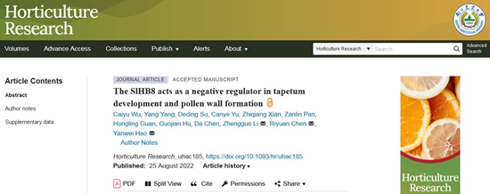 近日,乐竞在线注册陈日远团队联合重庆大学李正国团队在国际知名学术期刊Horticulture Research上发表了题为“The SlHB8 acts as a negative regulator in tapetum development and pollen wall formation in tomato”(全文链接:https://academic.oup.com/hr/advance-article/doi/10.1093/hr/uhac185/6675605)的研究论文。