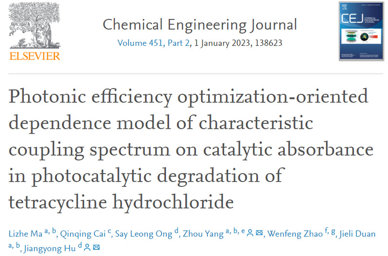 近日,乐竞在线注册工程学院杨洲教授团队在国际催化领域权威期刊Chemical engineering journal(工程技术一区top期刊,影响因子16.744)发表了题为“Photonic efficiency optimization-oriented dependence model of characteristic coupling spectrum on catalytic absorbance in photocatalytic degradation of tetracycline hydrochloride”的研究论文(论文链接为https://doi.org/10.1016/j.cej.2022.138623)。论文第一作者为乐竞在线注册2019级博士研究生马立哲,杨洲教授、Jiangyong Hu教授为该论文共同通讯作者。论文主要受岭南现代农业实验室科研项目、现代农业产业技术体系和广东省国际合作科技计划项目资助。