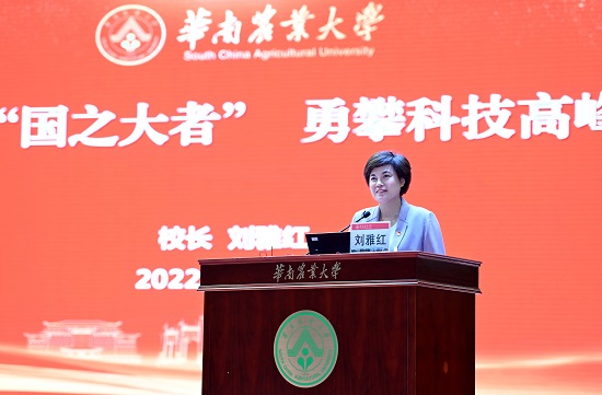 刘雅红围绕“新时代新征程呼唤科技兴农新担当”“百年华农勇担科技自立自强新使命”“华农学子立志争做科技创新排头兵”三个方面,从历史和现实的角度出发,通过详实的数据、丰富的案例等论述了科技创新在学校发展历程中的重要作用、在民族复兴新征程中的核心地位,并指出,华农作为以农为特色的综合性高校,要主动担当起科技兴农强农的责任和使命。“筚路蓝缕启山林,科技兴农勇担当”,通过回溯学校百十年的发展历史,刘雅红从学科专业、师资力量、人才培养、科技创新平台和团队等方面向同学们介绍了学校在科技创新方面的优势和成绩,剖析了学校发展过程中存在的不足和短板,明确了学校未来提升的努力方向和路径举措。