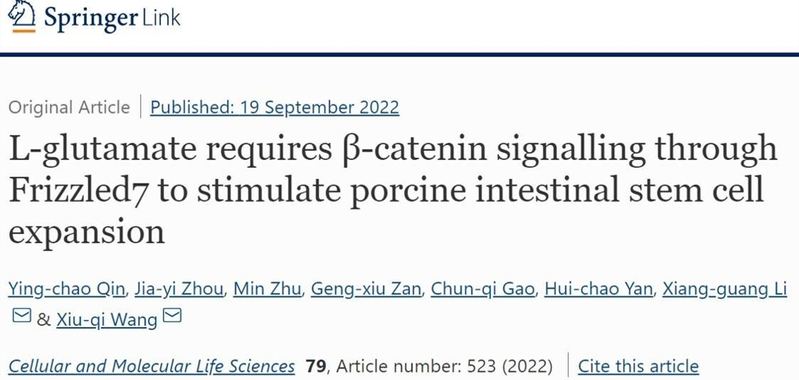 谷氨酸是食物和饲料中含量最丰富的氨基酸,对于促进肠道发育和健康具有重要功能。近日,乐竞在线注册动物科学学院、岭南现代农业科学与技术广东省实验室、广东省动物营养调控重点实验室、国家生猪种业工程技术研究中心王修启研究员团队在国际著名经典学术期刊Cellular and Molecular Life Sciences(影响因子10.002)上在线发表“L-glutamate requires β-catenin signalling through Frizzled7 to stimulate porcine intestinal stem cell expansion”的论文(链接https://link.springer.com/article/10.1007/s00018-022-04545-2 ),揭示胞外谷氨酸,与细胞膜上卷曲蛋白7(FZD7)受体结合,激活β-catenin,增强Wnt信号通路,提高肠道干细胞活性,促进肠上皮发育的新机制。