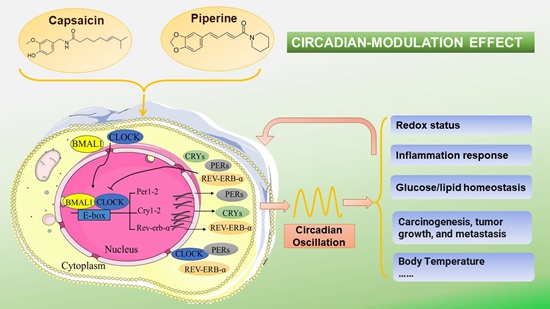 本课题组前期研究发现,香料中的生物活性成分辣椒素和胡椒碱可以在调节体温、代谢稳态、氧化应激、炎症反应和肿瘤发生过程中直接对肝脏核心时钟基因的表达也具有一定调控作用。通过对生物钟反馈环路的过程研究,充分发掘香辛料活性物预防和治疗代谢紊乱、氧化还原失衡、肠道菌群紊乱、炎症和癌症作用的分子机制。