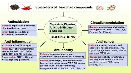 TRPV1通道是人体器官炎症状态、脂肪组织生热、肿瘤发生和昼夜节律时钟基因振荡的重要调节剂。香辛料中的刺激性植物化学物质通过激活TRPV1通道,有助于预防和治疗多种疾病(如癌症、肥胖、代谢异常与心脑血管疾病、生物钟紊乱等),具有显著的健康促进作用,作为天然低毒性的食源性化合物在食品行业具有巨大发展潜力。