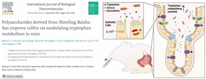 10月1日,兽医学院教授郭世宁课题组以兽医学院/岭南现代农业科学与技术广东省实验室/广东省兽用中药与天然药物工程中心为第一单位,在国际知名学术期刊 International Journal of Biological Macromolecules在线发表了题为“Polysaccharides derived from Shenling Baizhu San improve colitis via modulating tryptophan metabolism in mice”的研究论文(论文连接:DOI: 10.1016/j.ijbiomac.2022.09.246)。揭示了色氨酸代谢菌及其代谢物芳香烃受体调节肠道屏障功能的新机制。该论文的通讯作者为郭世宁,第一作者为青年教师吕伟杰。此论文受到国家自然科学基金(32072903, 31472232)和广东省重点领域研发计划项目“无抗饲料生物合成关键技术研究与应用”(2019B020218003)等项目的资助。