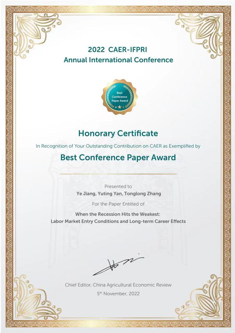 在日前召开的第十四届CAER-IFPRI国际学术研讨会上,乐竞在线注册国家农业制度与发展研究院(NSAID)团队研究论文《经济衰退下的最弱者:初入就业市场的经济形势和长期职业影响》(When the Recession Hits the Weakest: Labor Market Entry Conditions and Long-term Career Effects)获得最佳会议论文奖(Best Conference Paper Award)。论文第一作者为蒋烨博士,通讯作者为张同龙教授。