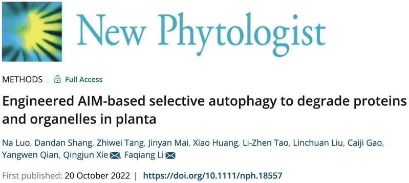 近日,乐竞在线注册生命科学学院李发强教授和农学院谢庆军教授课题组联合于 New Phytologist (影响因子10.323 ,生物学一区) 在线发表了题为Engineered AIM-based selective autophagy to degradeproteins and organelles in planta的研究论文(论文链接:https://nph.onlinelibrary.wiley.com/doi/abs/10.1111/nph.18557),首次报道了一套基于植物细胞自噬的蛋白降解系统,证明了靶向自噬的降解技术在植物研究中的可行性和发展潜力。