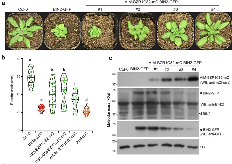 图 2. 自噬衔接蛋白 AIM-BZR1C82-mCherry 能选择性自噬降解内源的 BIN2
