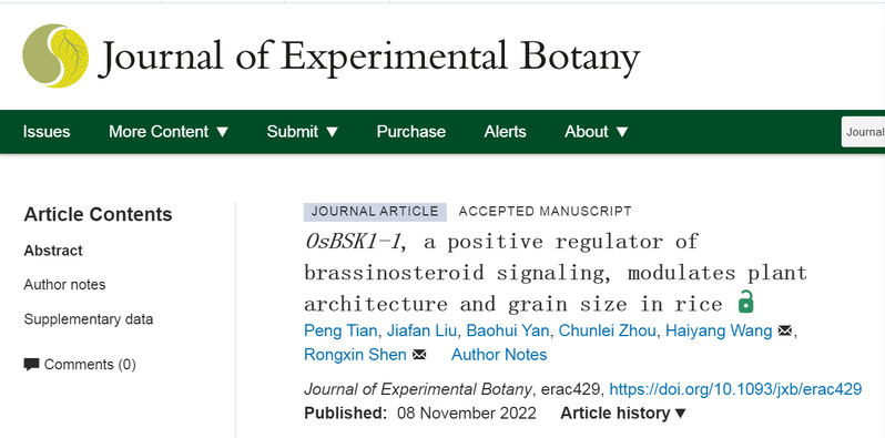 近日,乐竞在线注册生命科学学院、亚热带农业生物资源保护与利用国家重点实验室的沈荣鑫/王海洋团队在植物学知名期刊《Journal of Experimental Botany》(影响因子8.331,生物学JCR一区)在线发表了题为 “OsBSK1-1, a positive regulator of brassinosteroid signalling, modulates plant architecture and grain size in rice” 的研究论文(论文链接:https://doi.org/10.1093/jxb/erac429)。