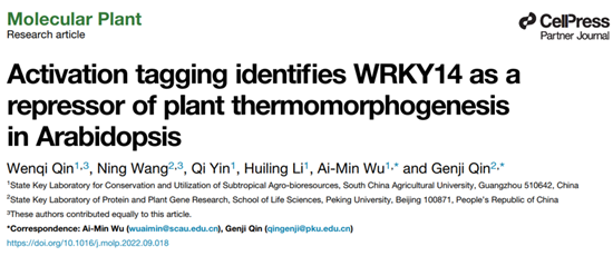 高温极端天气频次的增多和持续时间的增长已使全球气候变暖成为各国面临的共同问题,严重影响农作物生产和粮食安全。植物对高温响应的分子机制已成为植物学家非常关注的重要科学问题。PIF4在植物热形态建成中起到关键的调控作用,然而PIF4转录因子激活活性的精细调控机制仍不十分清楚。吴蔼民教授课题组和北京大学秦跟基教授课题组合作近期在国际著名学术期刊Molecular Plant在线发表了题为“Activation Tagging Identifies WRKY14 as a Repressor of Plant Thermomorphogenesis in Arabidopsis”的研究论文,发现了ABT1/WRKY14通过与转录因子TCP5相互作用来精细调控PIF4转录因子的活性,从而控制植物热形态建成,并揭示了WRKY14、TCP5和PIF4形成一个复杂的调控模块精细微调PIF4的活性以使植物响应不同的温度变化。