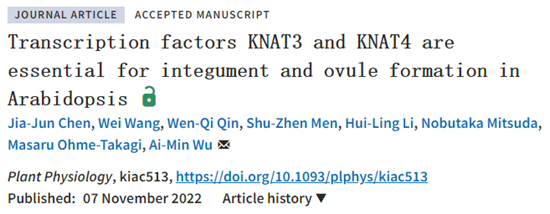 KNOX(Knotted1-like homeobox)家族基因编码同源异型结构域转录因子,分为KNOX I和KNOX II两个亚家族,在植物生长发育过程中起重要调控作用。其中I类基因调控顶端分生组织的发育,II类基因在不同植物组织中都有所表达,控制不同组织部位的发育。吴蔼民教授团队在KNOXII参与植物发育调控上开展了一系列工作,在国际知名植物学期刊Plant Physiology在线发表了题为“Transcription factors KNAT3 and KNAT4 are essential for integument and ovule formation in Arabidopsis”的研究论文(论文链接:https://doi.org/10.1093/plphys/kiac513)。