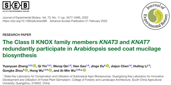 吴蔼民教授团队在Journal of Experimental Botany上发表了“The Class II KNOX family members KNAT3 and KNAT7 redundantly participate in Arabidopsis seed coat mucilage biosynthesis”的研究论文。该研究报道了II类KNOX亚家族成员KNAT3和KNAT7正调控拟南芥种子的粘液质生物合成,其功能缺失导致种子粘液质产生和柱状层形成缺陷。该文章被JXB遴选为当期Insight paper,作者Saez-Aguayo和Largo-Gosen在题为“Rhamnogalacturonan-I forms mucilage: behind its simplicity, a cutting-edge organization”的论文(Journal of Experimental Botany 73, 11:3299–3303)中高度评价这部分工作对RGI参与的种皮粘液的调控作用。