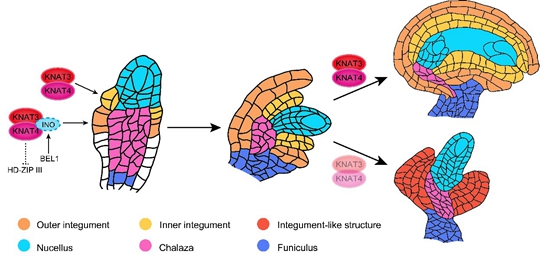 在植物的有性生殖过程中,珠被包裹珠心发育成完整的胚珠才能与花粉受精形成胚囊。现有研究已经报道了许多影响胚囊发育的调控因子,但胚囊发育的具体转录调控机制并不十分清楚。课题组研究发现拟南芥中II类KNOX基因成员KNAT3与KNAT4之间存在功能冗余,双突突变体中内外珠被不能正常发育,产生类珠被结构(integument-like structure),致使不能形成完整的胚珠,从而产生不育的性状。利用酵母双杂,双荧光素互补和免疫共沉淀实验发现KNAT3与KNAT4两者之间存在互作,并且两者都与外珠被调控因子INO存在互作,KNAT3/4和INO以复合体的形式调控外珠被的发育。以上结果证明了KNAT3与KNAT4是胚珠珠被发育重要的调控因子,为植物的生殖生长发育提供了理论根据。