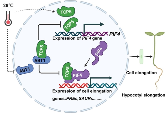 WRKY14的氨基酸序列与ABT2/WRKY35、ABT3/WRKY65和ABT4/WRKY69的氨基酸序列高度相似并属于系统发育树中的同一进化支,这些WRKY的功能均未知。过量表达ABT2/WRKY35、ABT3/WRKY65或ABT4/WRKY69的转基因株系均表现出和abt1-D类似对高温不敏感的表型。通过构建多重突变体,发现abt1 abt2 abt3 abt4四重突变体表现出与abt1-D相反的表型,对高温更敏感,下胚轴更长;进一步通过酵母双杂交、荧光素酶互补和Co-IP等实验证明了ABT1可以与TCP5、TCP13和TCP17相互作用;通过一系列生化实验,研究者揭示了ABT1调控植物热形态建成的分子机制,即ABT1和TCP5的相互作用,一方面抑制了TCP5对PIF4转录的激活,另一方面通过与PIF4争抢TCP5抑制了PIF4-TCP5转录激活复合体的活性,从而精细调控PIF4的转录激活活性和植物对高温的反应。研究者还通过一系列的遗传互作实验证明了ABT1确实与热形态建成的正调控因子PIF4、TCP5和BZR1具有相反的作用。