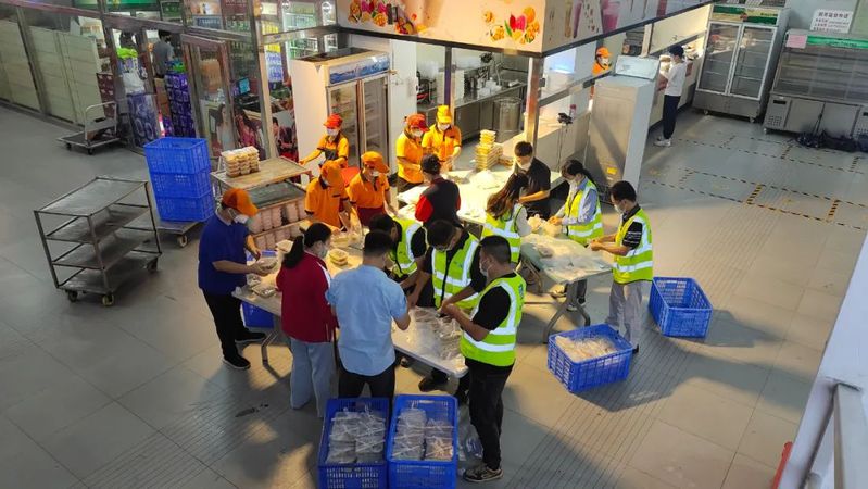 凌晨4点半,饮食服务中心加班加点赶制餐食,送到封控楼栋楼下,为校园抗击疫情筑起坚强后盾。校园临时管控期间暂停堂食,为了减少排队取餐的等待时间,总务部在校人员分成6组分别赶往各大食堂,协助打包、分发、装车配送和维持秩序。据统计,23日当天保障供应早餐约1.5万份、午餐4.5万份、晚餐3.8万份,在满足基本用餐保障的基础上,总务部尽可能提供更多菜式供师生选择,目前各大食堂食材储备充足,可以保证每日三餐的正常供应。此外,总务部还为每位同学准备了新鲜水果,并抽调人手派送,用“苹”安和“橙”意,向每位学生道声“晚安”。