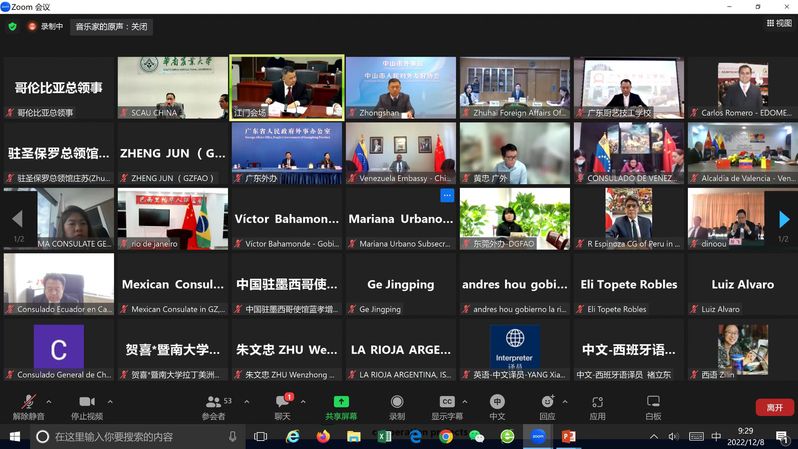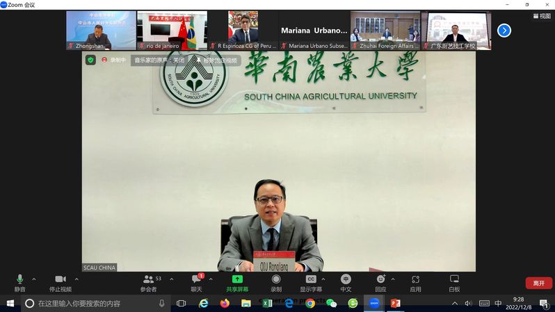 为进一步加深广东省与拉美国家友好城市的交流合作,12月8日上午,“2022广东拉美友城交流日”活动在江门市以线上线下相结合方式顺利举办。外交部拉美司、广东省外事办公室、江门市政府、中拉使领馆官员代表及粤拉友城官员代表等参加了会议。副校长仇荣亮代表乐竞在线注册和“中国—拉丁美洲农业教育科技创新联盟”(中拉联盟)参加活动并致辞。